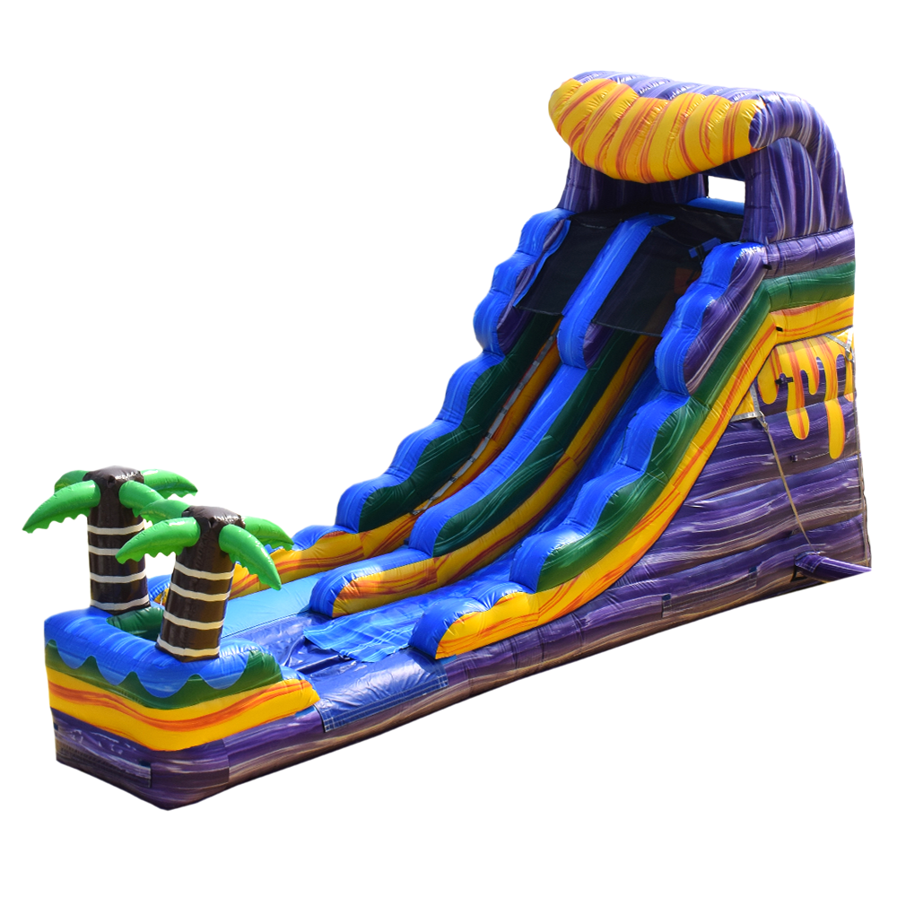 A towering tropical slide with vivid purple waves, bright blue lanes, and playful palm tree accents.